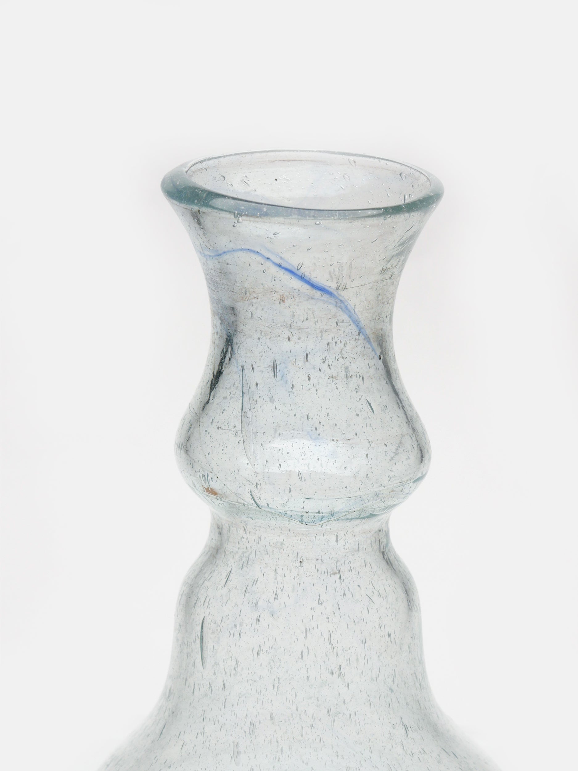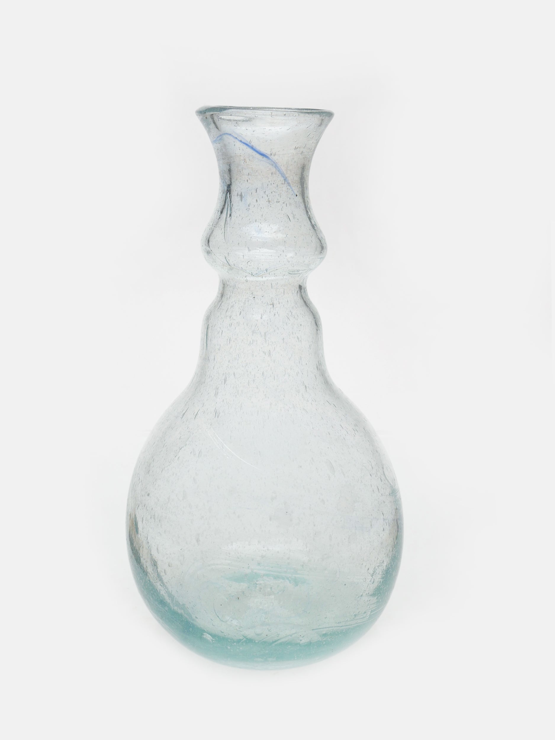 Hand-blown glass carafe in light blue tones, featuring a distinctive double-bulb silhouette with a narrow waist and wide pouring rim. Crafted in Egypt's traditional glassmaking workshops, this piece is flecked throughout with tiny bubbles that catch and diffuse light, creating a luminous effect. The elegant form and delicate aqua hue make it perfect for serving water or holding flowers.