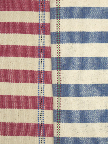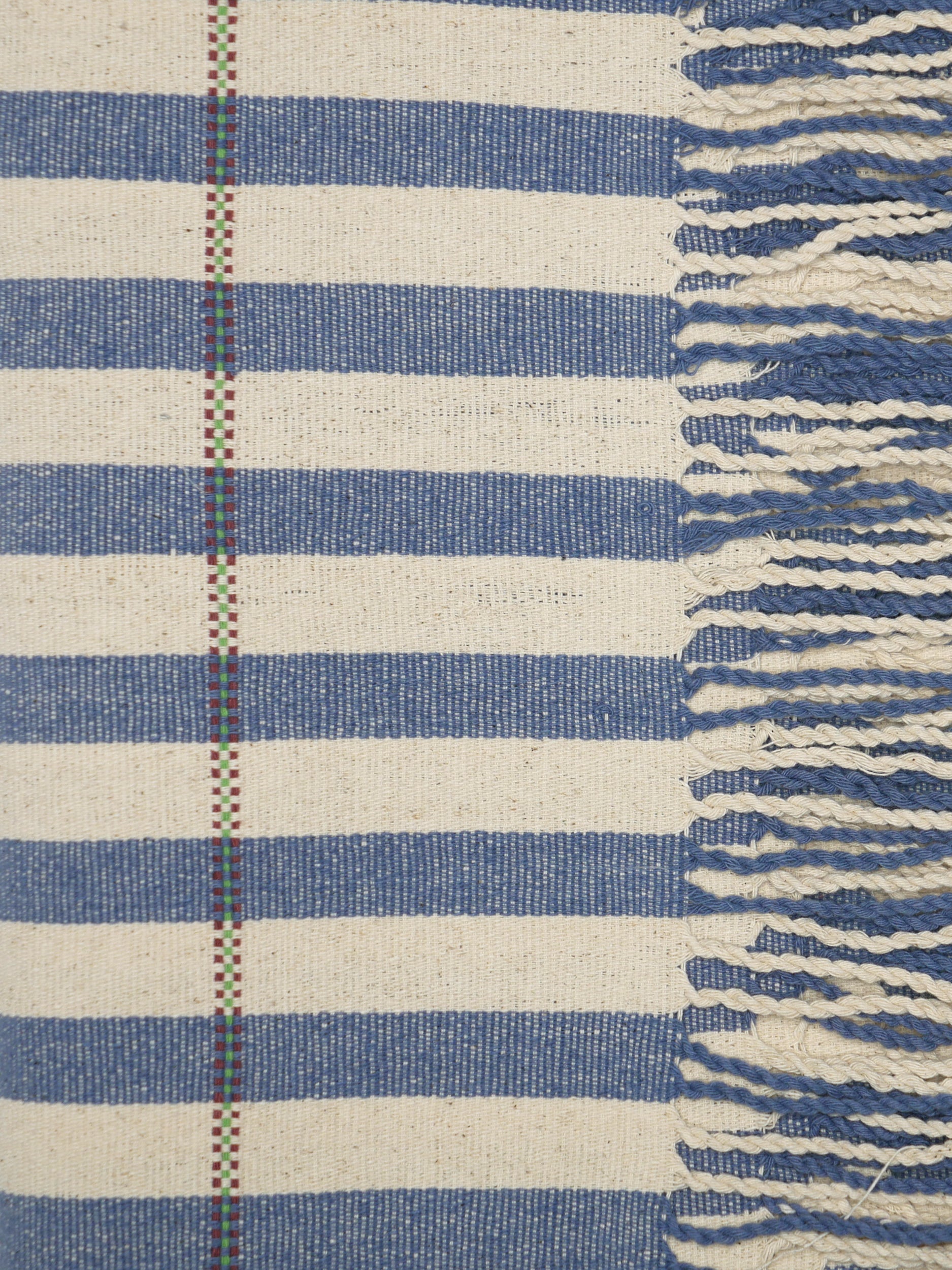 Handwoven throw, skilfully made on a backstrap loom by Karin women in northern Thailand. This versatile piece, made of locally grown, hand spun cotton, captivates with its bold blue and white stripes, the subtle variations in the weave adding depth and movement to the pattern. The horizontal green stripe and the generous fringe are added details that create a dynamic visual rhythm reflect the traditional aesthetic and an eye toward modern design.