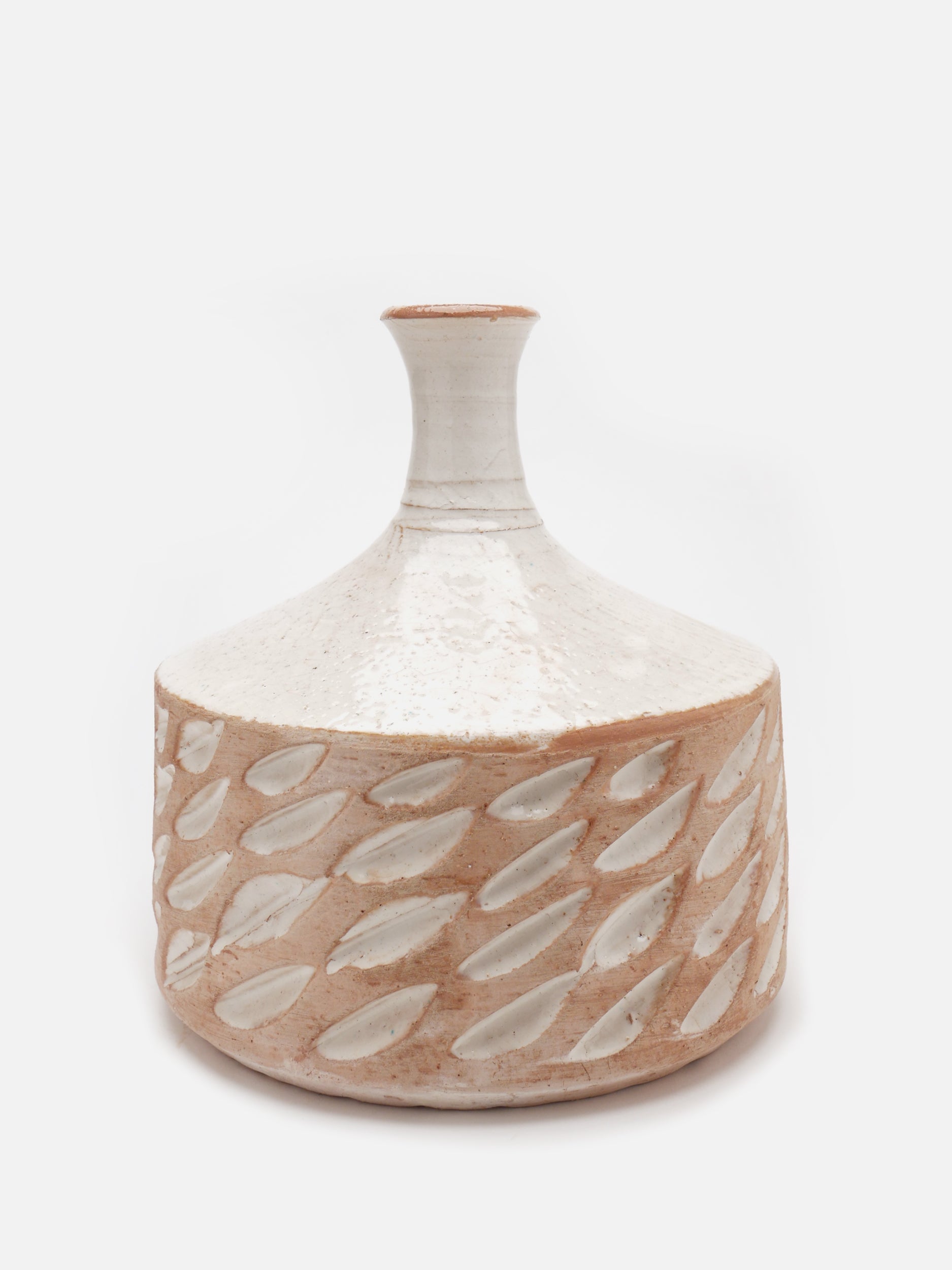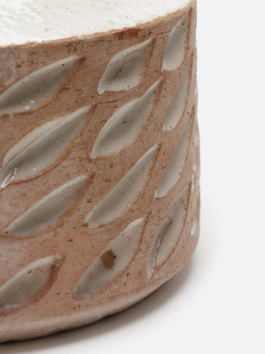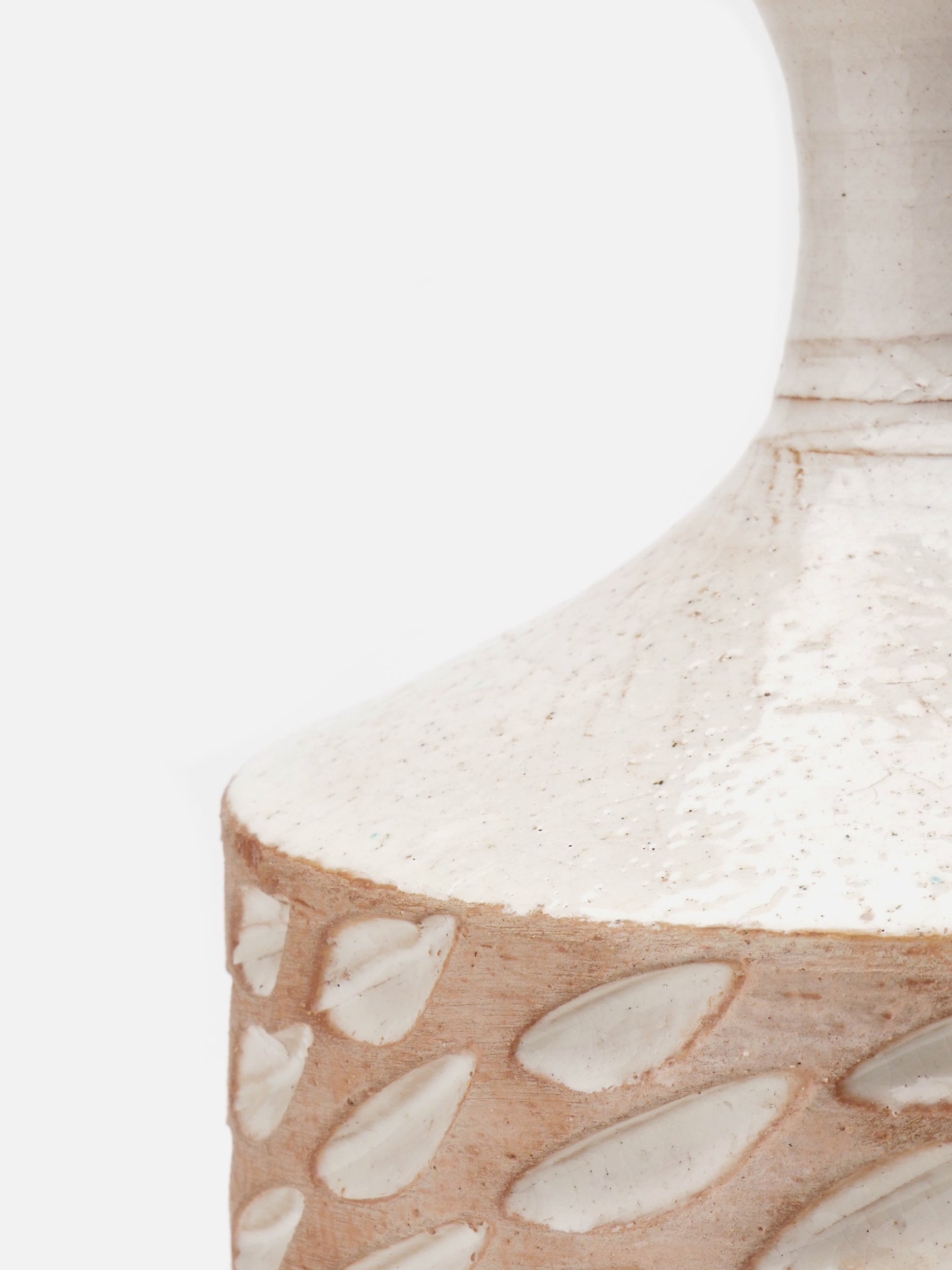 Sculptural ceramic lamp base featuring raised white leaf impressions on warm terracotta clay with smooth cream glaze on the neck—a tactile piece that combines traditional Fayoum craftsmanship with functional home décor.