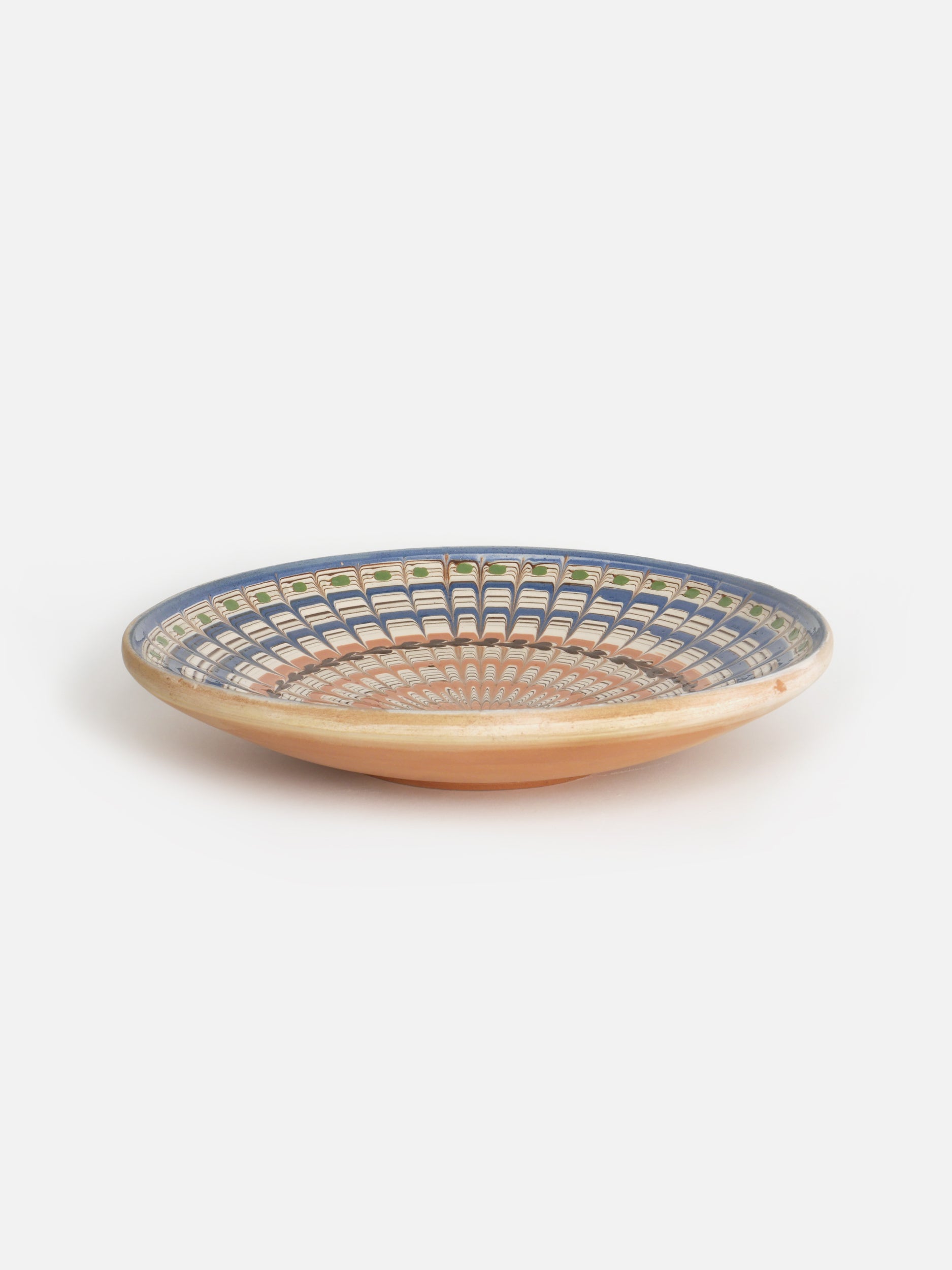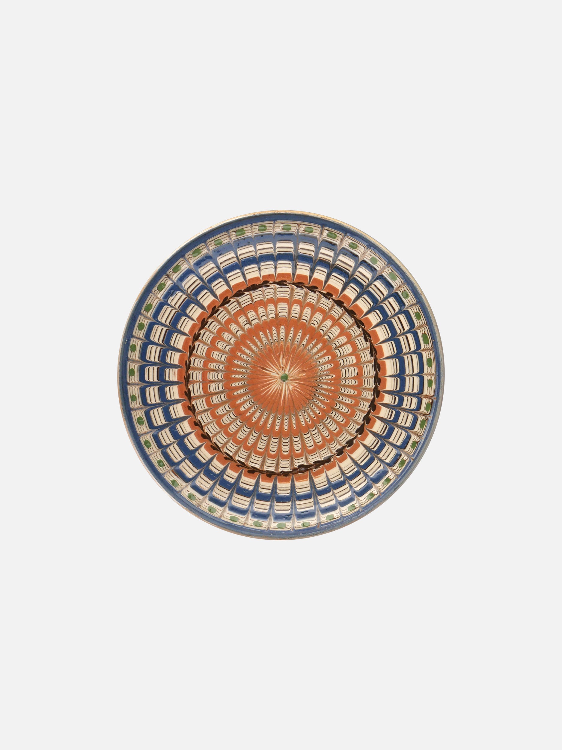 Medium plate featuring a mesmerising radiating pattern in blue and copper tones. Made on a potter's wheel and hand painted with ancestral motifs, this piece showcases the UNESCO-protected heritage of Horezu pottery. The warm terracotta exterior and decorative glazed interior make it perfect for serving or wall display.