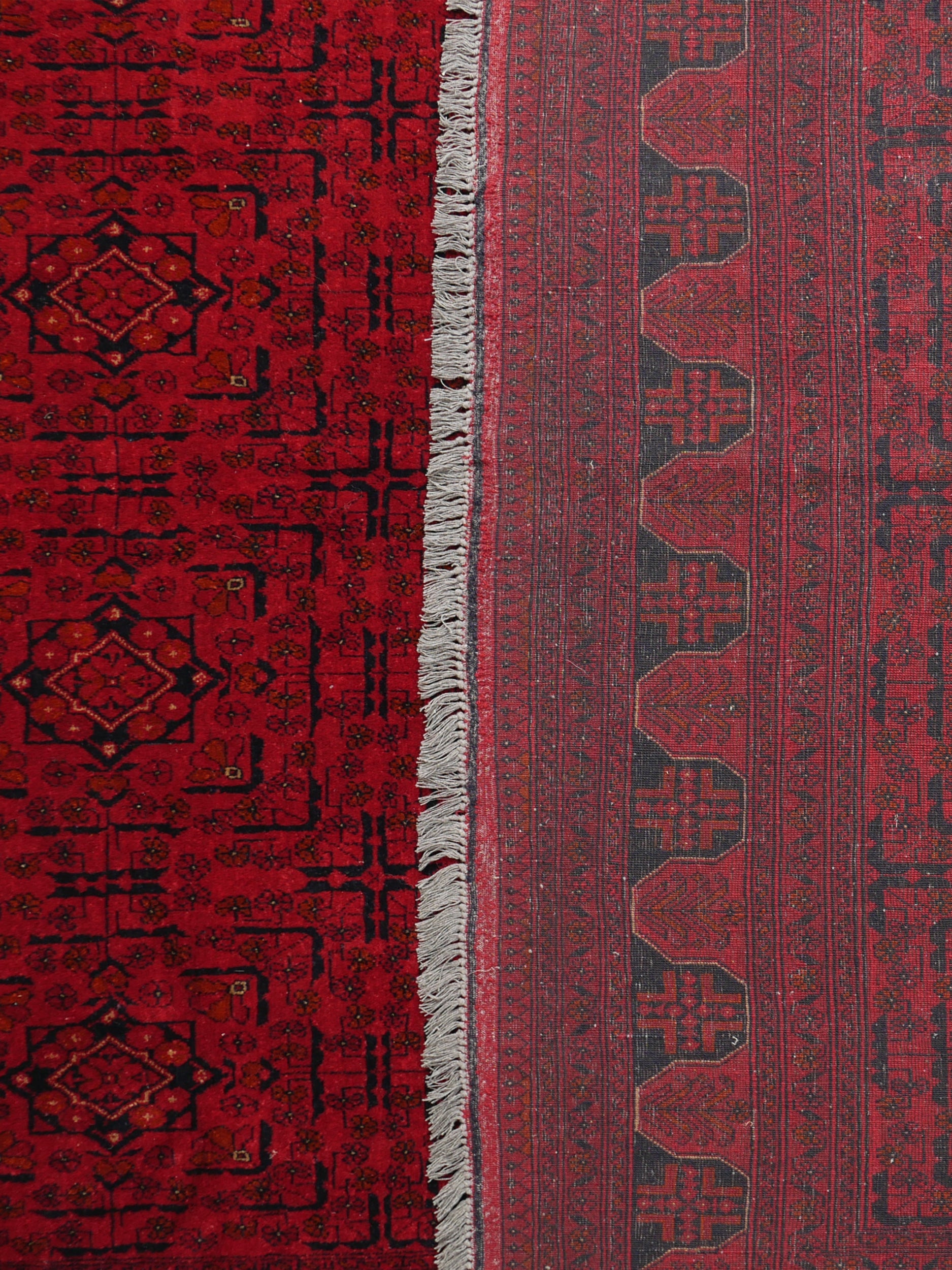 The Maker. This vintage piece was created by Turkmen weavers in northern Afghanistan (Andkhoy). The Turkmen tribes, renowned for their mastery of classic gul patterns and rich crimson colourations, created carpets that served as both practical furnishings and symbols of tribal identity for nomadic families.