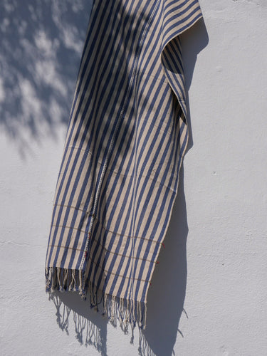 Plaid tissé à la main, confectionné avec art sur un métier à tisser à sangle dorsale par des femmes Karin du nord de la Thaïlande. Cette pièce polyvalente, réalisée en coton local filé à la main, séduit par ses rayures bleues et blanches audacieuses. Les subtiles variations du tissage confèrent profondeur et mouvement au motif. La rayure horizontale verte et les franges généreuses sont autant de détails qui créent un rythme visuel dynamique, reflet de l'esthétique traditionnelle et d'une sensibilité au design contemporain .